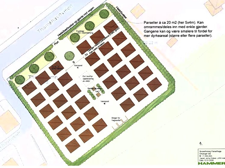 Skissen over omfatter en plan for hele området. I første omgang kan det bli snakk om et mindre areal. Orkanger ungdomsskole har allerede varslet interesse for å bruke noe av området til dyrking. I en parsellhage kan du dyrke fram dine egne grønnsaker, urter og andre vekster. Litt sjølhushold er i tida.
